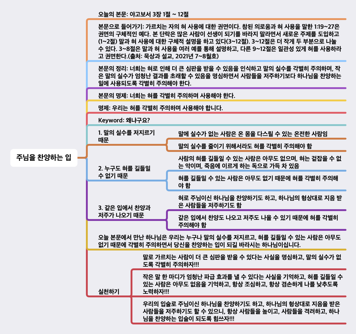 * 본문의 정리: 너희는 혀로 인해 더 큰 심판을 받을 수 있음을 인식하고 말의 실수를 각별히 주의하며, 작은 말의 실수가 엄청난 결과를 초래할 수 있음을 명심하면서 사람들을 저주하기보다 하나님을 찬양하는 일에 사용되도록 각별히 주의해야 한다.